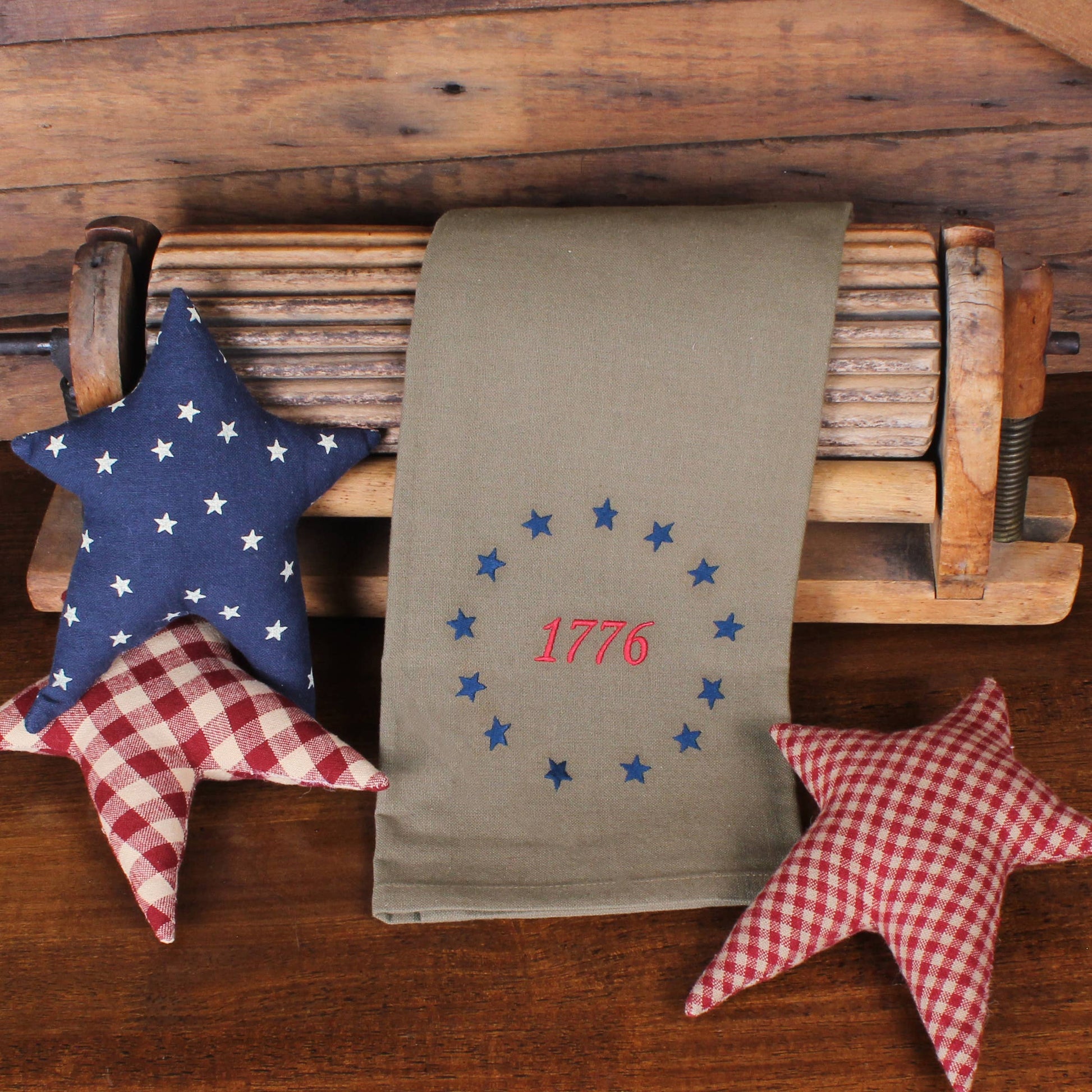 A quiet nod to American heritage, our 1776 Embroidered Towel is a thoughtful accent for the everyday home. Stitched with classic red and blue details on a soft olive khaki-colored cotton ground, it brings a sense of history and understated patriotism to your kitchen or hearth space. Equally fitting for seasonal display or daily use, this towel is designed to feel collected rather than decorative.