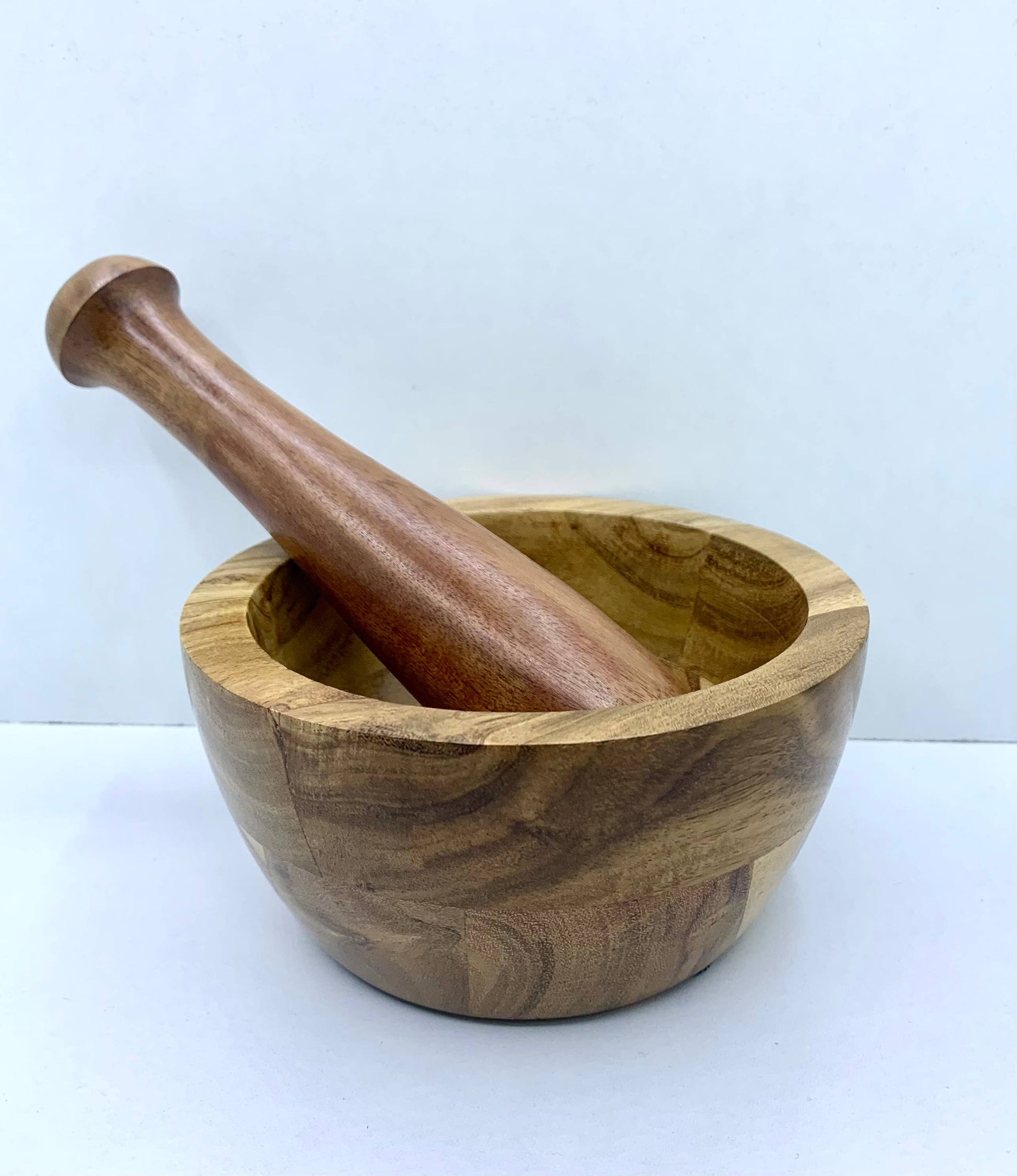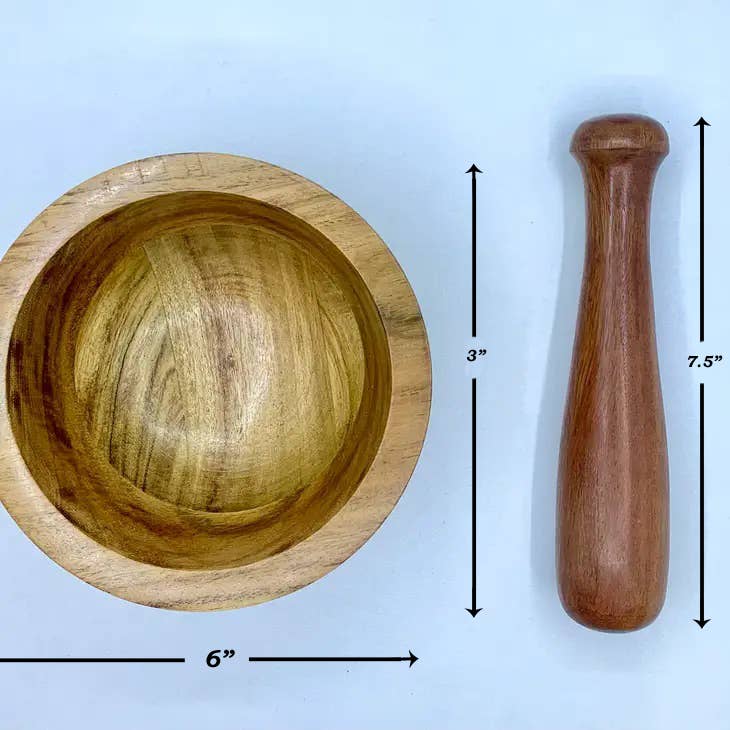 The pestle - 7" Bowl outer Diameter: 7" Height: 2.5 to 3 inches Depth: 2 to 2.5 inches CARE INSTRUCTIONS: Washing And Drying Hand wash with warm water and mild detergent/liquid wash. Rinse with warm water. Never soak your wooden utensils in water to avert swelling and peeling. After washing, dry them immediately. Hang them to dry, or wipe away the moisture with a towel