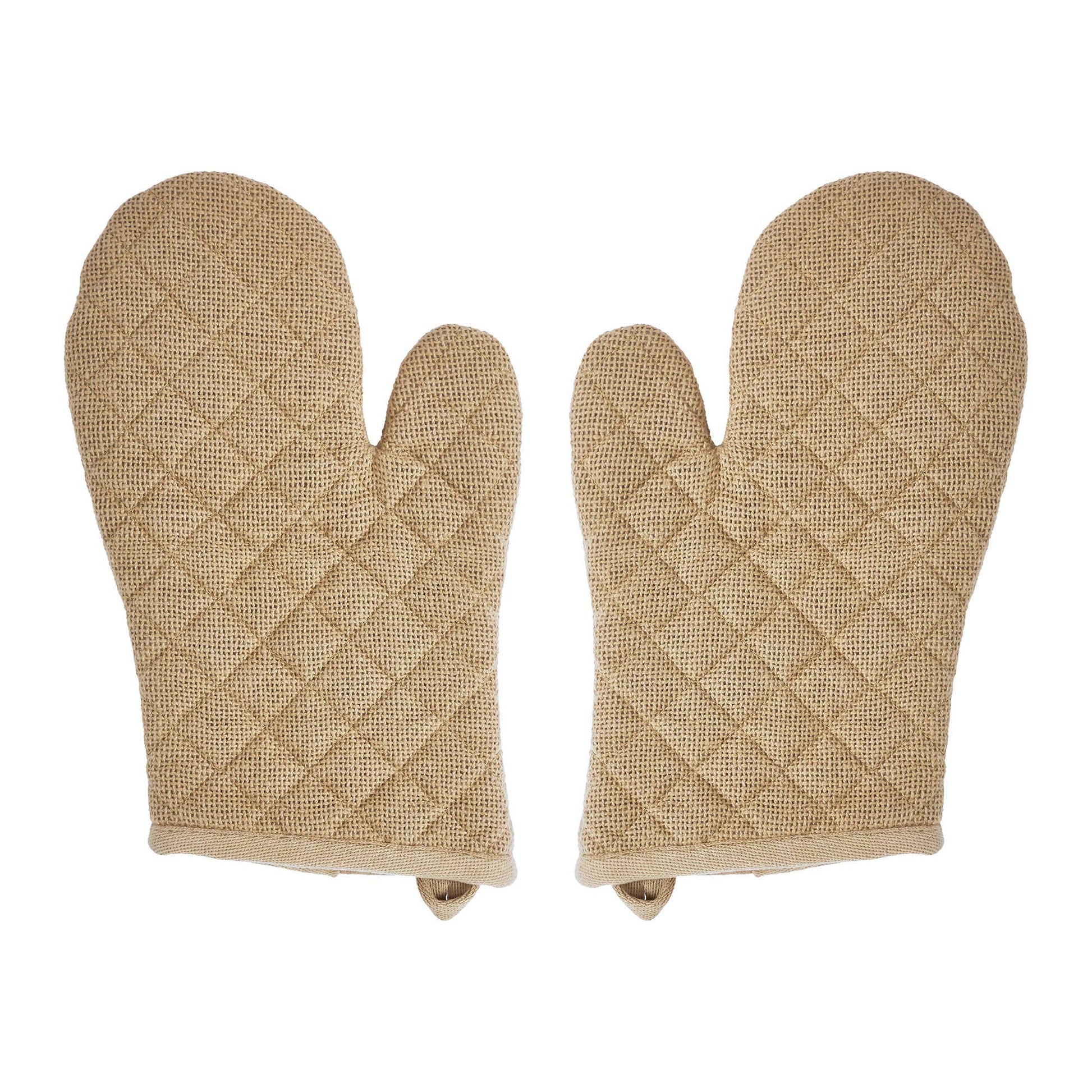 Set of two oven mitts in a natural burlap finish for rustic farmhouse style