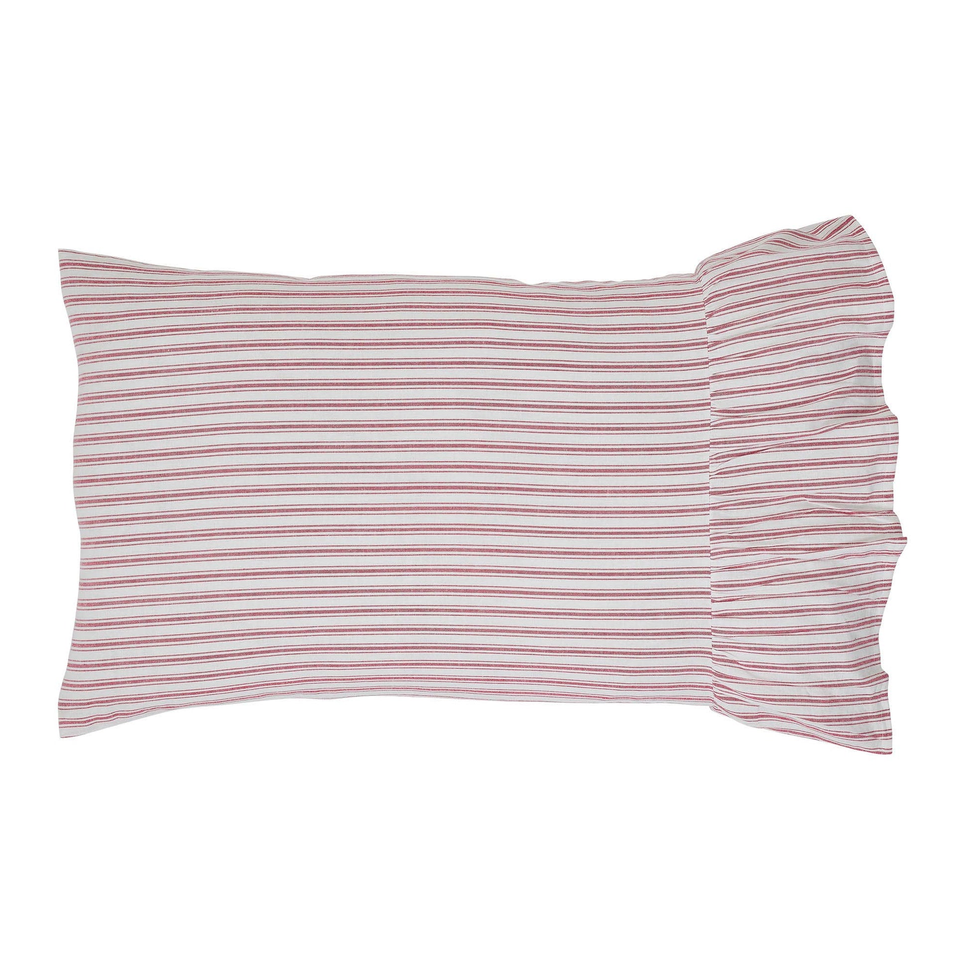 Remember the comfort of grandma's house with these timeless Standard Sham Set of 2, each one measuring 27Lx21W+8. These are rectangular, machine washable and tumble dry safe. You can even iron them! Fashioned from 100% cotton, they are as soft and durable as the bonds that tie us together. In shades of apple red and soft white, they evoke memories of homemade apple pie cooling on the kitchen counter. With a nod to the farmhouse and cottage styles, they blend seamlessly into any decor. The ruffling, with its ruffled edge, is a nostalgic touch that adds texture and depth. The best part? They're reversible! The same striped pattern you love on the front is on the back too. Can you imagine slipping into a bed made up with these? The past and the future meet in the present, bringing comfort and style into your home.